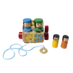 Incluye: 01 Papa, 01 Mama, 03 Hijos (Los muñecos llevan dibujados sus rostros) , lleva una cuerda de 60cm para jalar.