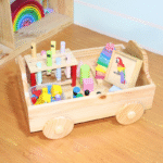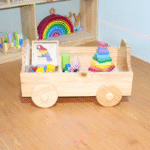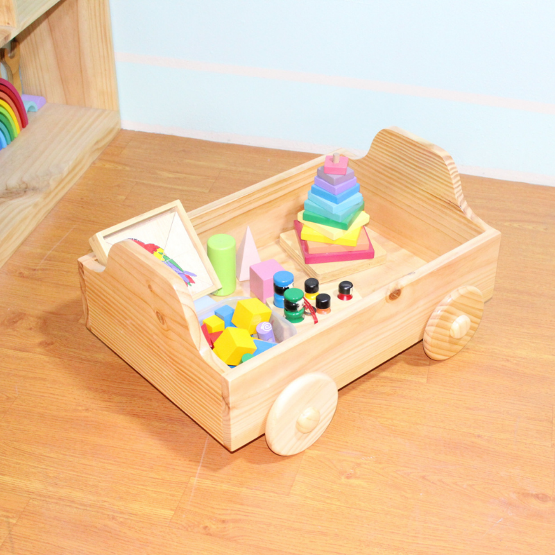 CARRETA JUGUETERO MATERIAL: Elaborado en Madera Pino, acabado al Natural, viene con una cuerda para jalar. MEDIDAS: 60cm x 40cm x 30cm