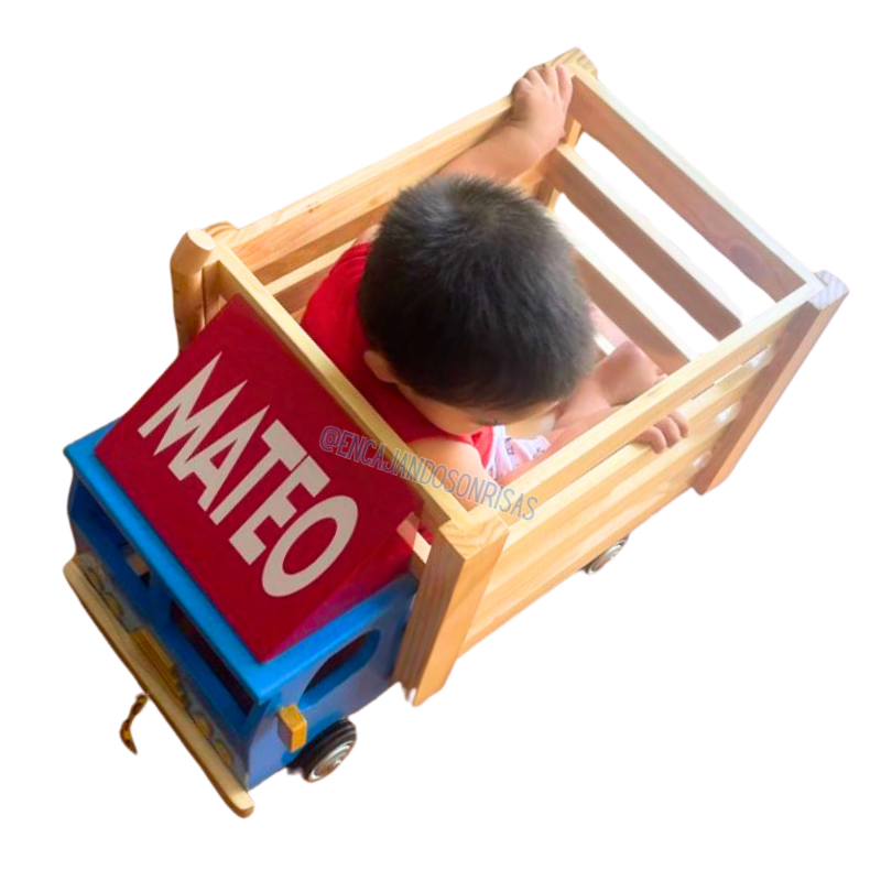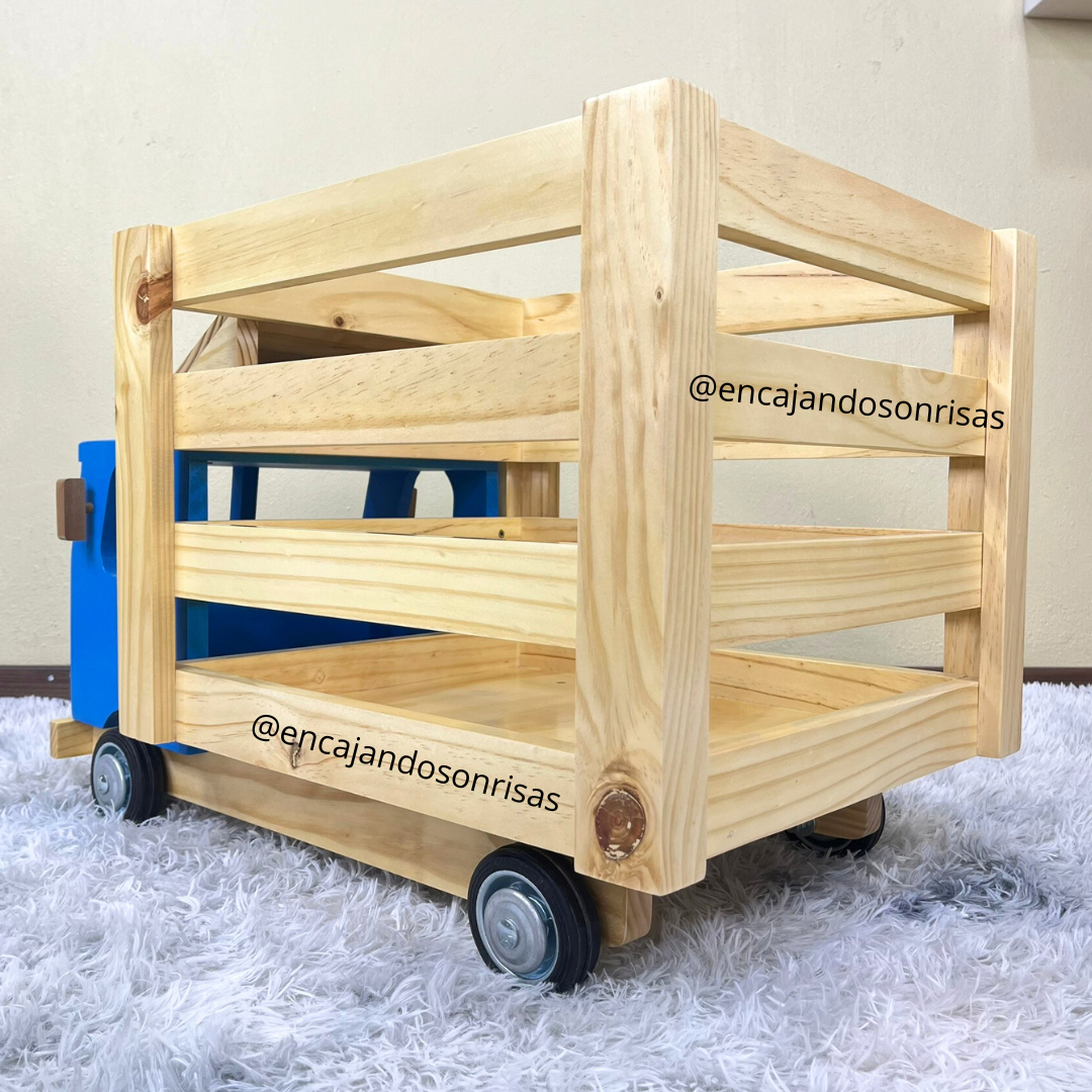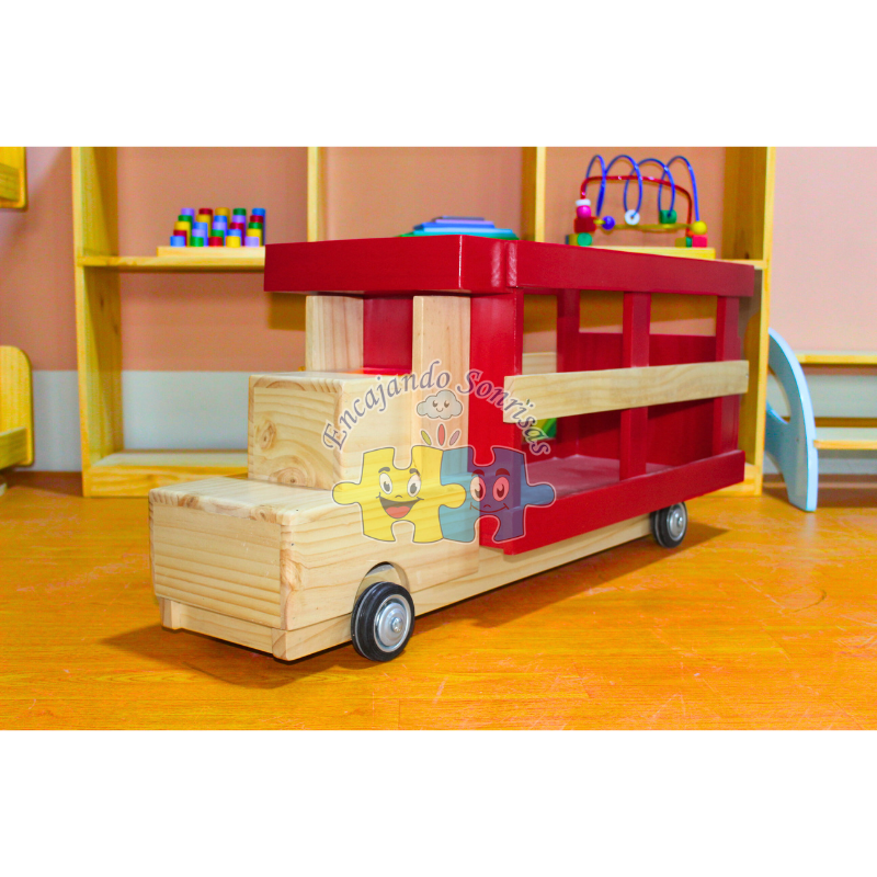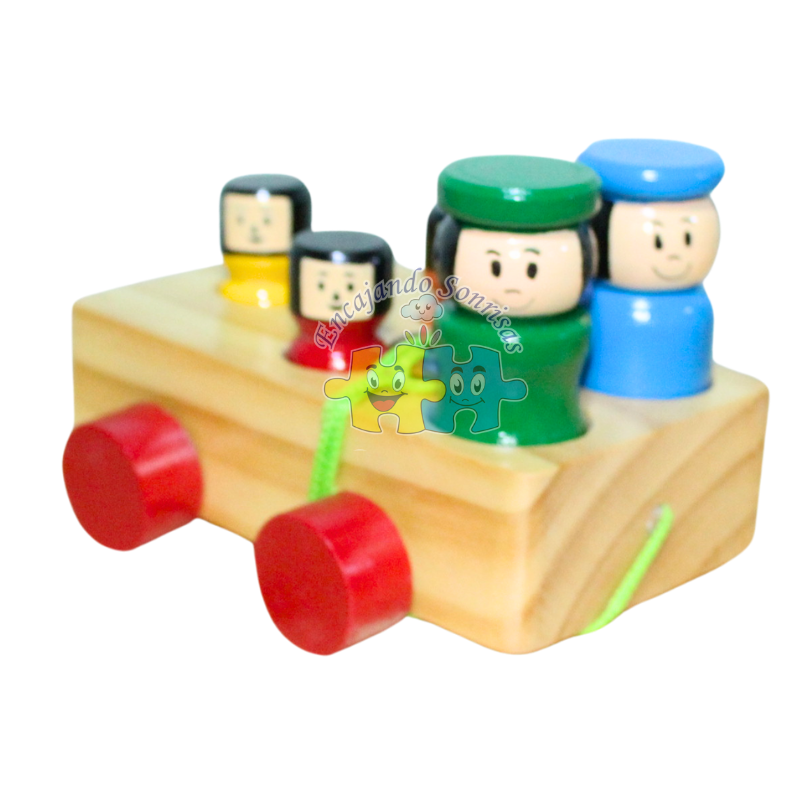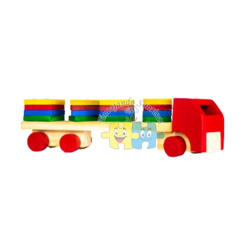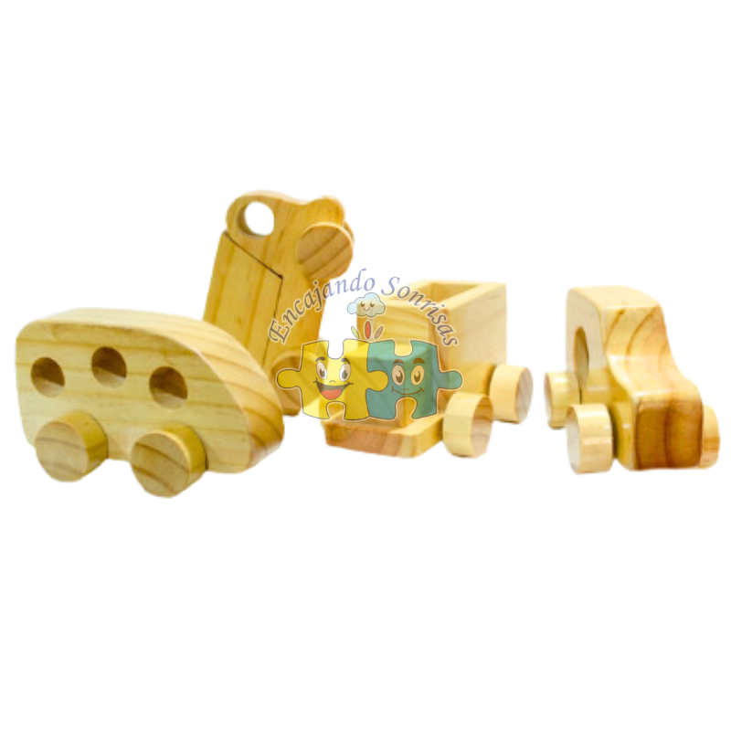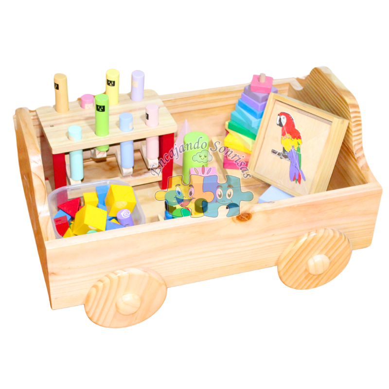 Tren elaborado en madera pino, con figuras de encaje de colores, 3 bagones que se pueden separar.